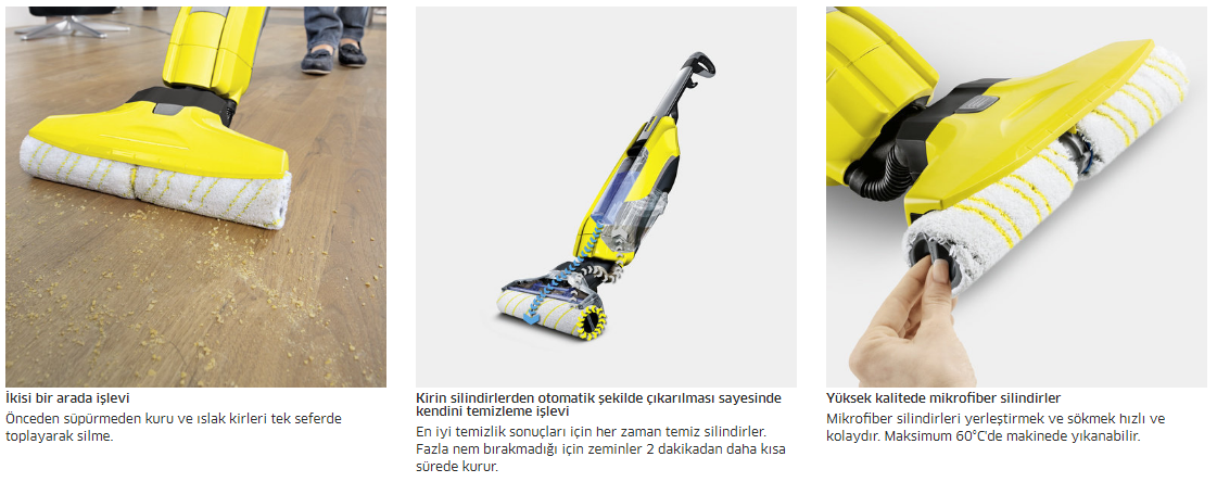 Zemin Temizleme Makinesi Karcher FC 5'in ikisi bir arada işlevi, ıslak ve kuru kirleri tek adımda temizlemenizi sağlar. Önceden süpürmeye gerek kalmaz, zemin temizliği hiç bu kadar kolay ve hızlı olmamıştı. Otomatik olarak sürekli temiz su ile ıslatılan, dönen mikrofiber silindirler kiri toplar, su-kir karışımı sürekli olarak silindirlerden vakumlanarak kirli su haznesine gönderilir. Bu pratik kendi kendini temizleme işlevi silindirlerin her zaman temiz kaldığı anlamına gelir. Yaygın yöntemlere kıyasla Karcher FC 5, %85'e kadar daha az su kullanırken, önemli ölçüde daha iyi temizleme performansı sağlar. Karcher FC 5 ahşaptan, seramikten veya plastikten yapılmış tüm standart sert zeminlerde kullanılabilir.